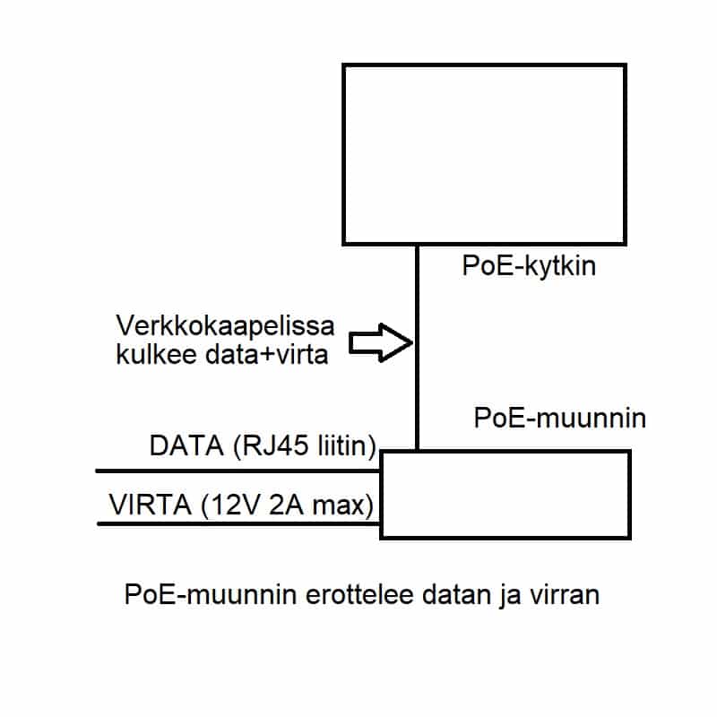 Huom. PoE-muunnin pitää asentaa suojattuun IP-55 tai parempaan laiterasiaan jos muunnin asennetaan valvontakameran kanssa ulkokäyttöön.